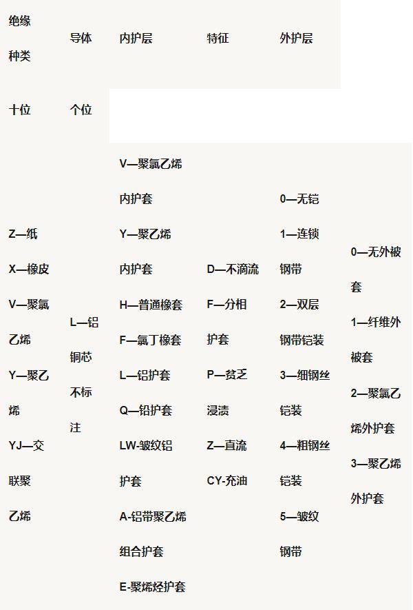 型號內容包含其用途類型、絕緣材料、導體材料、鎧裝保護層等。在型號后面還注有線芯根數、截面、工作電壓和長度。