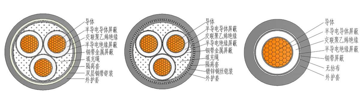 其結(jié)構(gòu)由內(nèi)至外分別為:1、導(dǎo)體;2、導(dǎo)體屏蔽;3、絕緣層;4、絕緣屏蔽;5、銅帶屏蔽;6、填充物;7、包帶;8、內(nèi)護(hù)套層;9、鎧裝層;10、外護(hù)套。